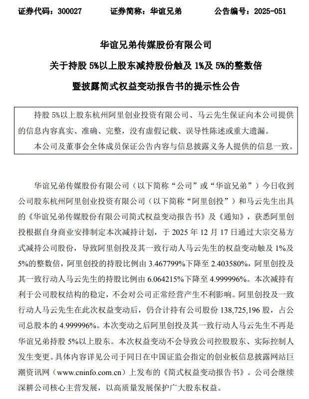 12月17日,华谊兄弟发布公告称,公司股东阿里创投于2025年12月17日通过大宗交易方式减持2952.68万股,持股比例由3.467799%降至2.403580%。阿里创投及其一致行动人马云合计持股比例由6.064215%降至4.999996%,不再是公司持股5%以上股东。